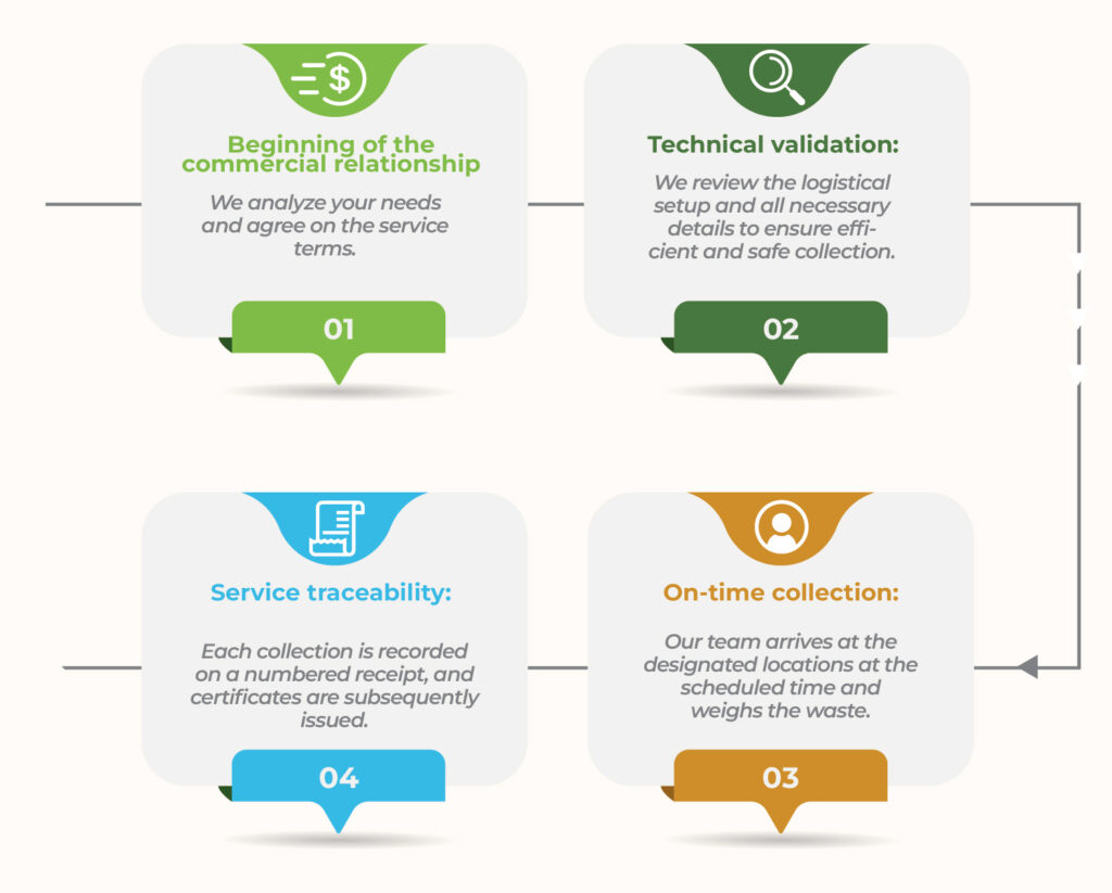 At GDA, we offer a comprehensive waste management solution designed to adapt to your needs and generate positive environmental impacts. Our process combines operational efficiency, regulatory compliance, and ongoing support: